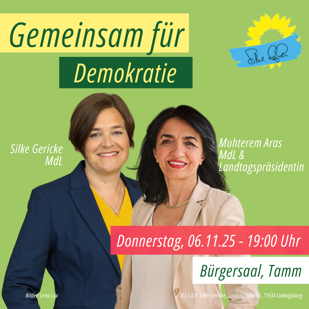 Darüber spricht Silke Gericke, MdL, mit ihrer Kollegin Muhterem Aras MdL (Präsidentin des Landtags von Baden-Württemberg), und Bürgermeister Martin Bernhard. Gemeinsam soll der Frage nachgegangen werden, was jede und jeder Einzelne tun kann, um Demokratie im Alltag lebendig zu halten.