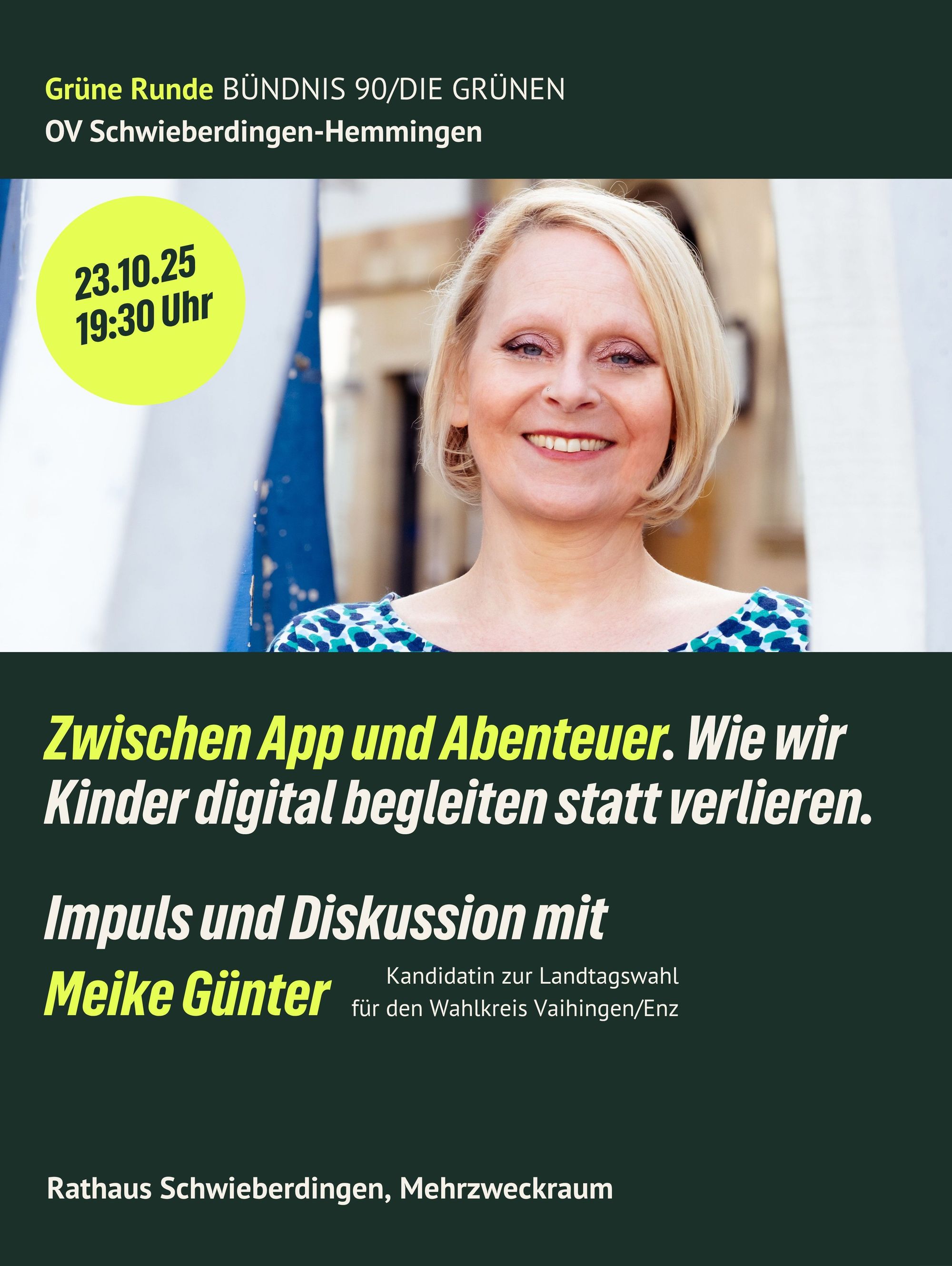 Der Ortsverband Schwieberdingen-Hemmingen lädt ein zur Grünen Runde mit Impulsvortrag und Diskussion. Wie gelingt ein guter Umgang mit digitalen Medien im Familienalltag?