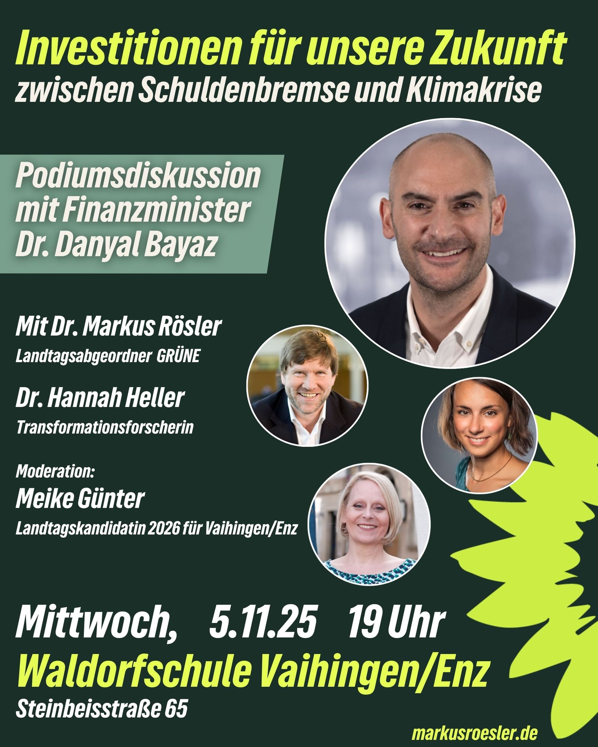 Um diese und weitere Fragen zu diskutieren, lädt Dr. Markus Rösler, unser Landtagsabgeordneter für Vaihingen/Enz, zur Podiumsdiskussion ein. Zu Gast sind Dr. Danyal Bayaz, Finanzminister des Landes Baden-Württemberg, und Dr. Hannah Heller, Transformationsforscherin und Beraterin.